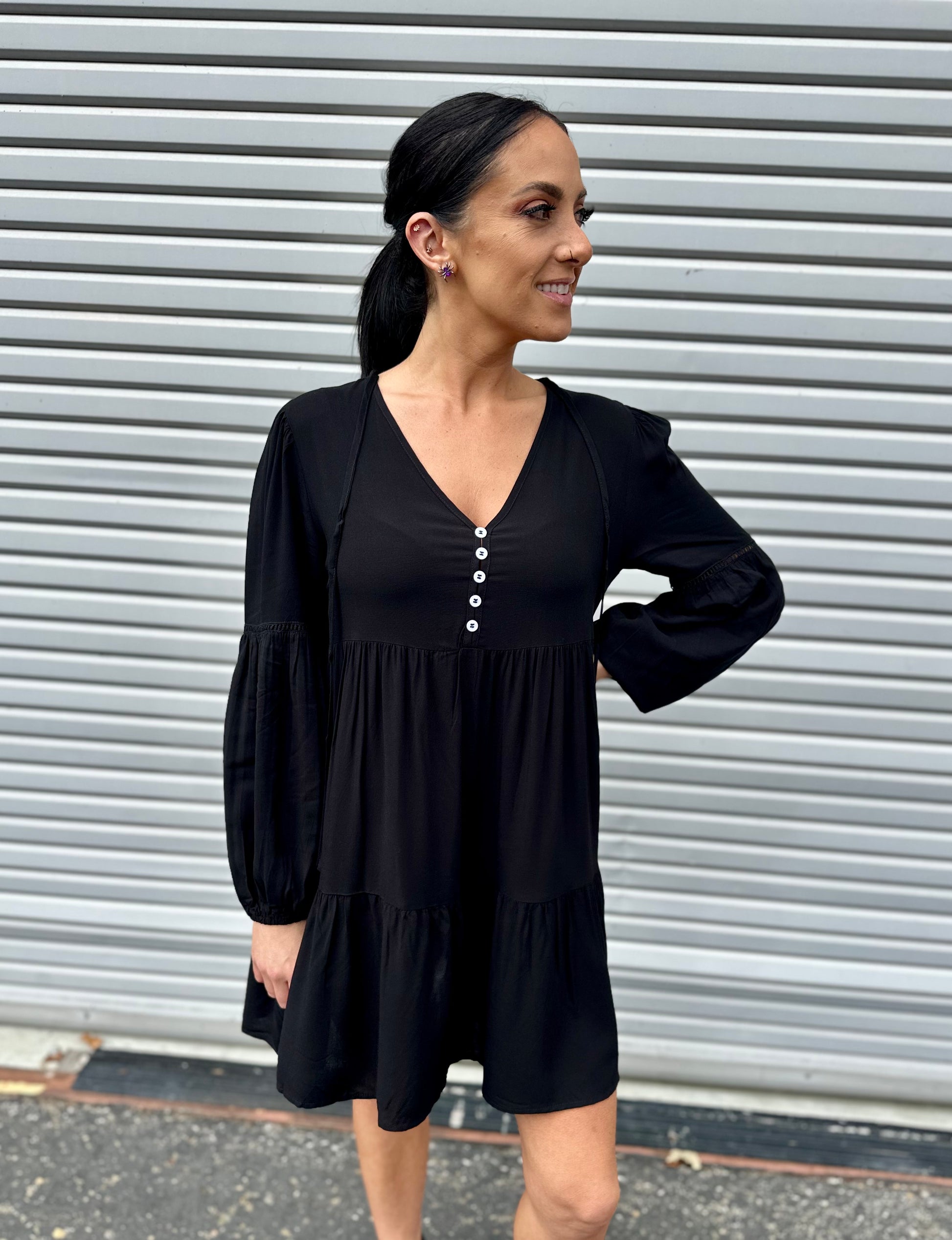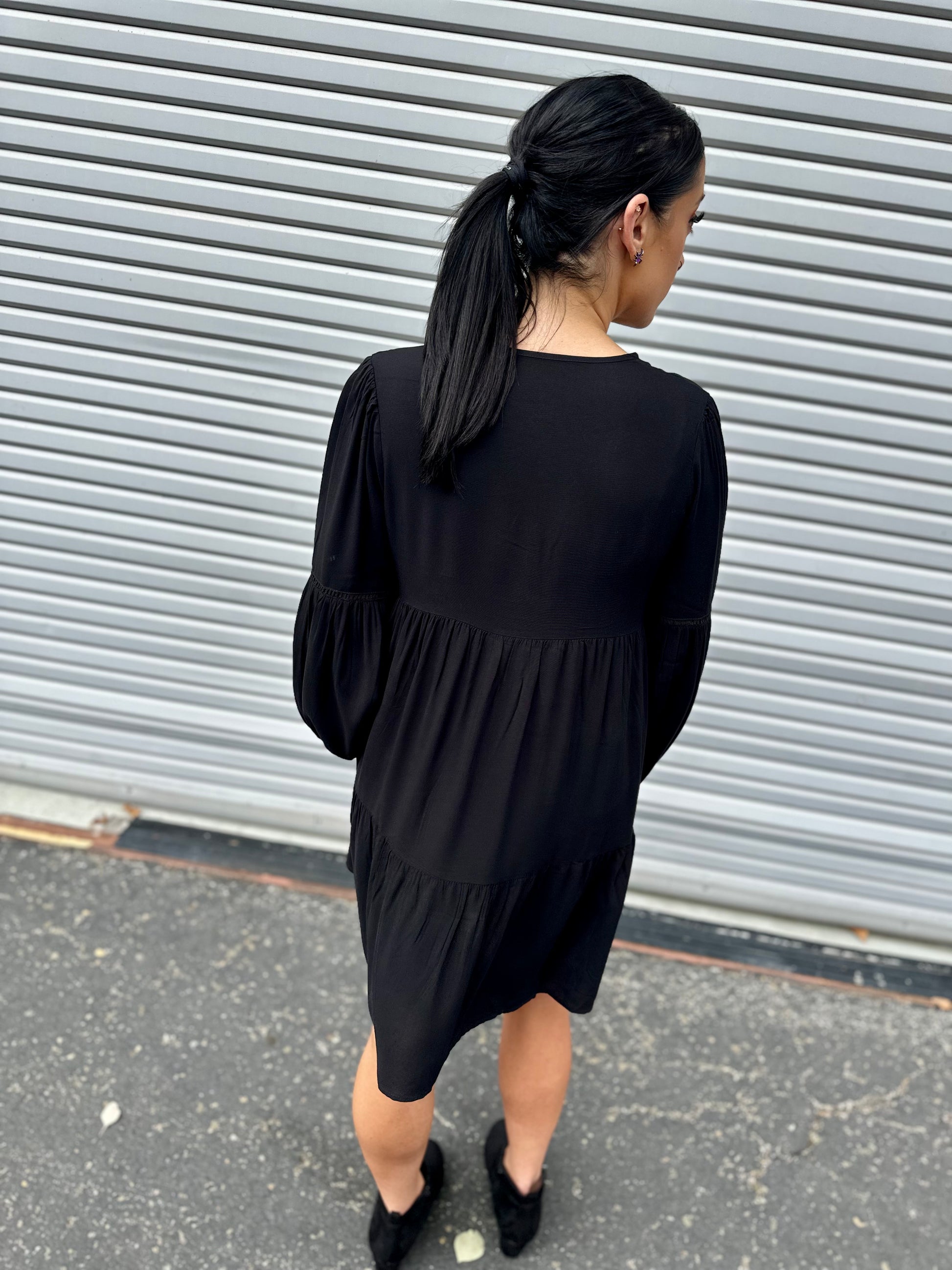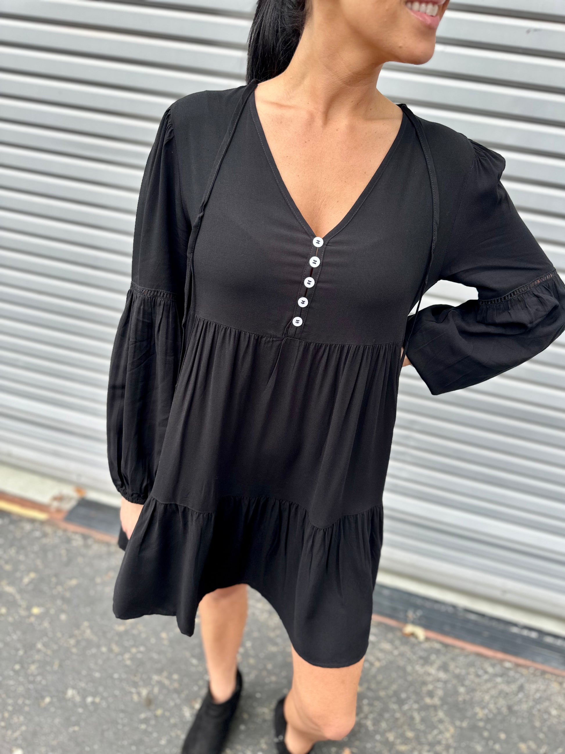 Elevate your wardrobe with this versatile black babydoll dress, designed with a relaxed, tiered silhouette for effortless style. Featuring a flattering V-neckline and decorative white button detailing, this long-sleeve dress is perfect for both casual days and dressed-up nights. The flowy, lightweight fabric ensures comfort, while the puffed sleeves add a touch of elegance. Whether you pair it with boots for a chic concert look or sandals for a weekend brunch, this timeless piece is a must-have. Available now in sizes for every body type!