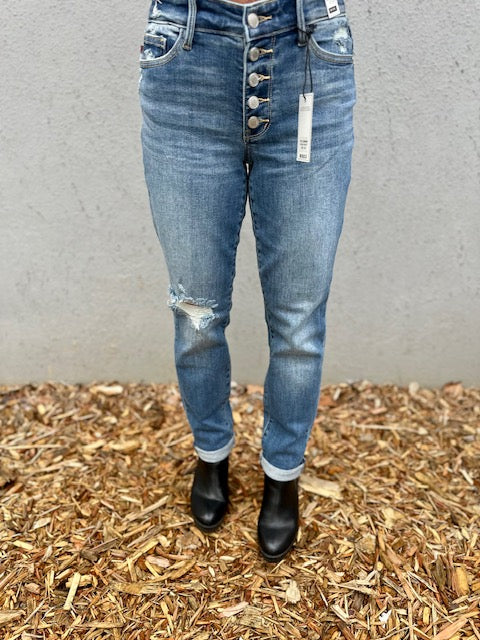 Say hello to your new favorite denim! The Maven Button-Fly Boyfriend Jeans offer a relaxed, vintage-inspired fit with a modern twist. Featuring a flattering high rise, trendy exposed button-fly closure, and light distressing for a lived-in look, these jeans blend comfort and style effortlessly. The soft, stretch denim ensures all-day wearability, while the cuffed hem adds a laid-back, casual vibe—perfect for pairing with sneakers or booties. Dress them up with a blouse or keep it chill with a graphic tee—these jeans do it all.