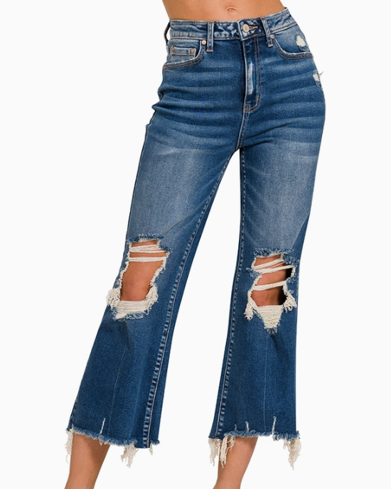 Meet the jeans that bring bold style and everyday comfort together. The Rebel Distressed Flare Capri Jeans feature a flattering mid-rise fit, eye-catching distressed details, and a flared cropped hem that’s perfect for warm-weather days.