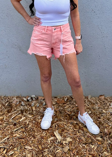 Add a playful pop of color to your summer wardrobe with our Royal High Rise Side Slit Shorts in a bold and fun coral pink wash! These stylish denim shorts feature a flattering high-rise fit, edgy distressed details, and raw frayed hems for that effortlessly cool vibe. The subtle side slit adds extra movement and a touch of flair, making them perfect for anything from casual brunches to beach days.