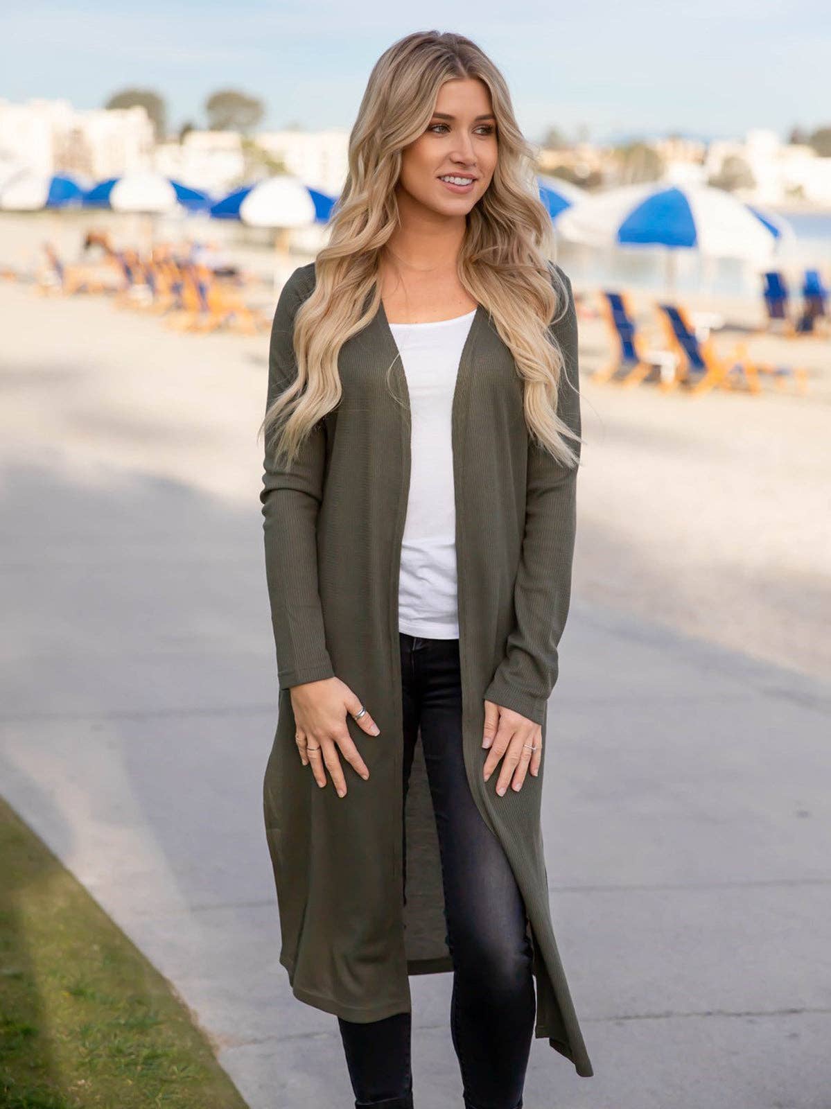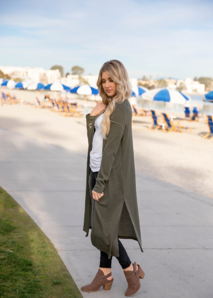 Made from a soft, breathable knit, it drapes beautifully over any outfit — from jeans and a tank to leggings and a tee. Available in Olive and Gray, two timeless neutrals that go with everything in your wardrobe.