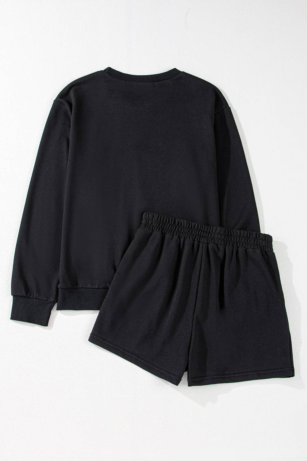 Cozy up and rep your team in style 🏈 The Sunday Kickoff Game Day Lounge Set is here to make your football-watching outfit cuter than the halftime show. This matching black sweatshirt and shorts duo features bold “GAME DAY” lettering with a textured football graphic front and center—and a mini football patch on the shorts for extra sporty flair.